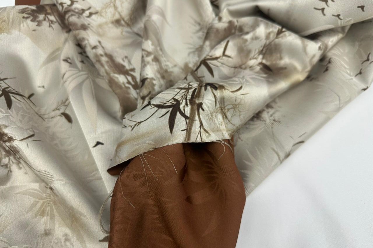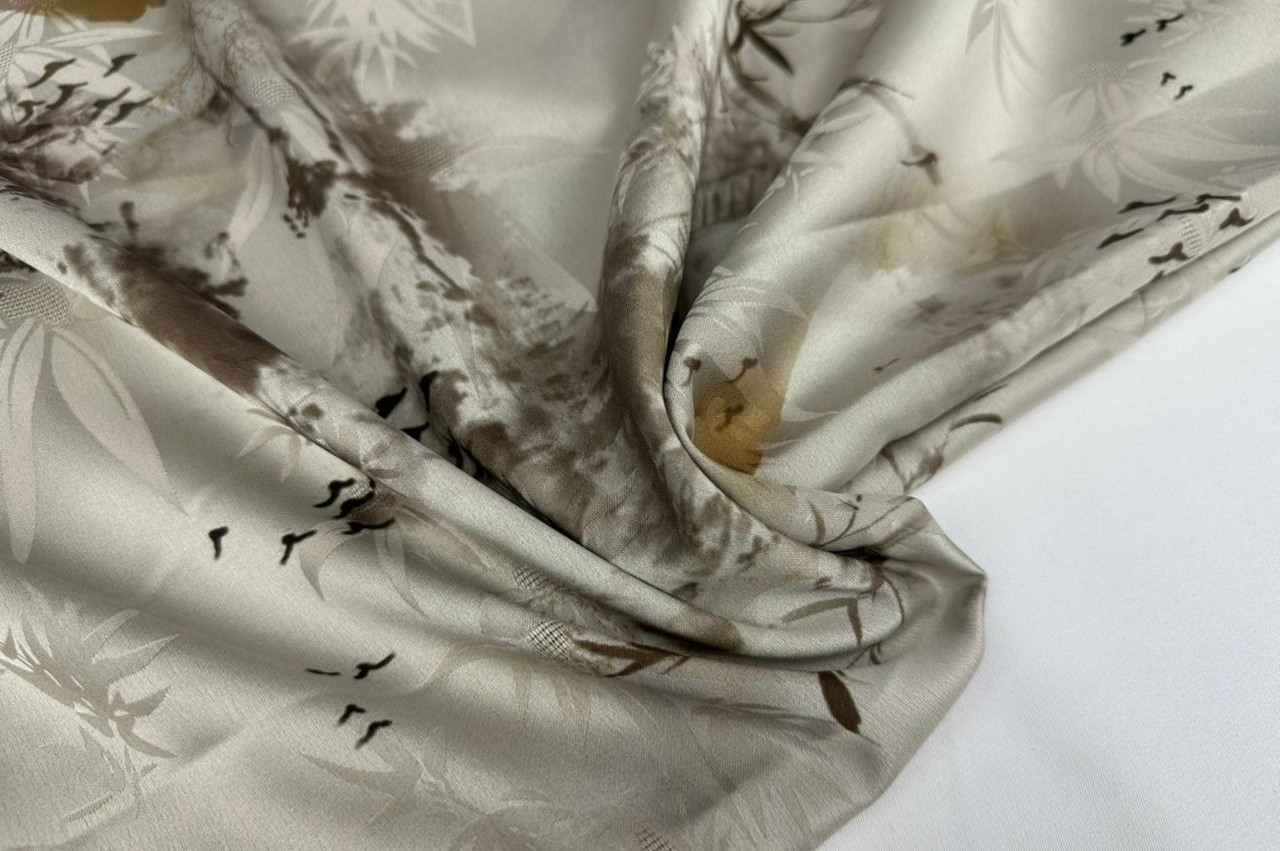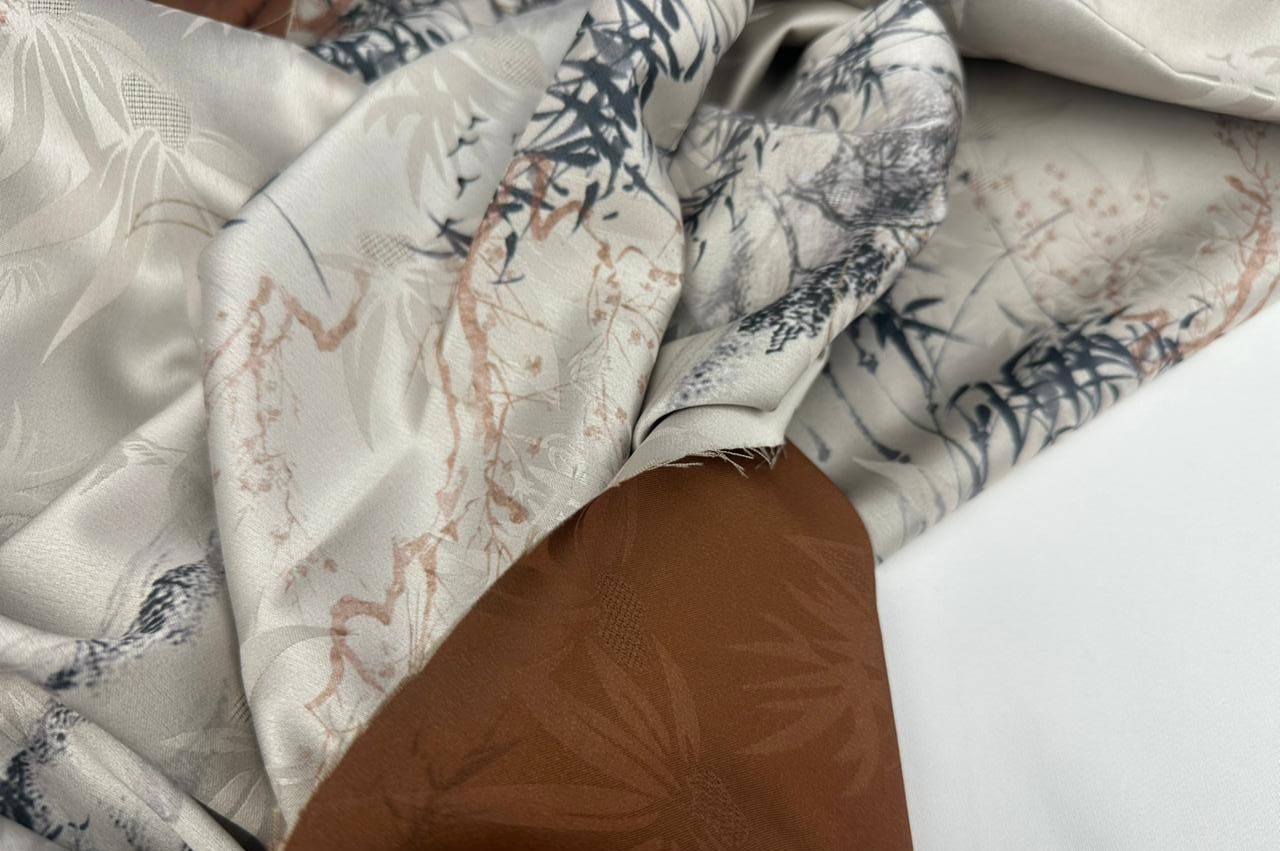 Эта шелковая ткань не тянется . Имеет контрастную изнанку. Не светится. Из ткани с таким оригинальным рисунком получаются очень красивые платья , блузки и костюмы.